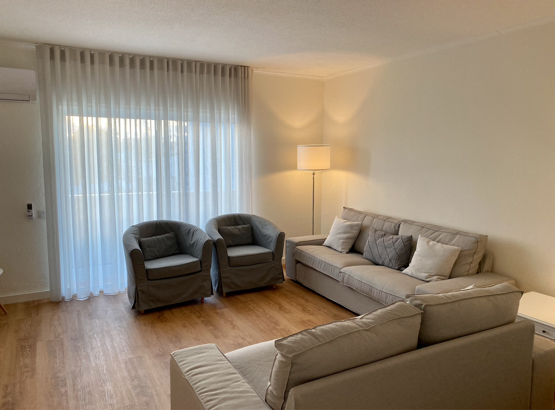 Apartamento perfeito para férias em família, com capacidade até 8 pessoas. Tem três quartos de dormir, duas instalações sanitárias, quarto de jantar, cozinha e espaçosa sala com varanda.